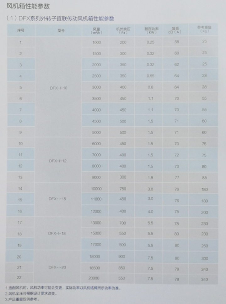 型號說明:DFX指低噪音風機箱,HTFC指消防排煙風機箱,I指單速風機,II指雙速風機(特殊配置,訂貨需注明)