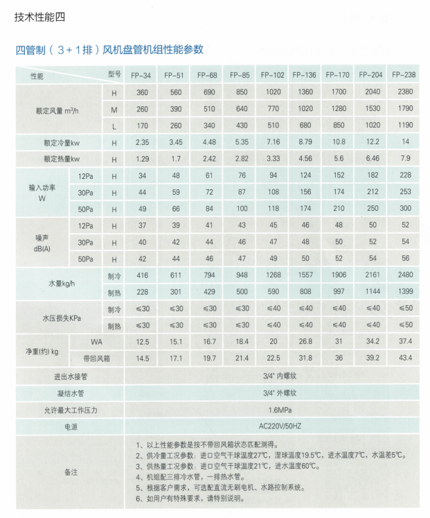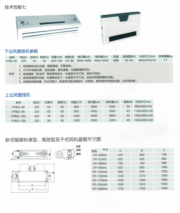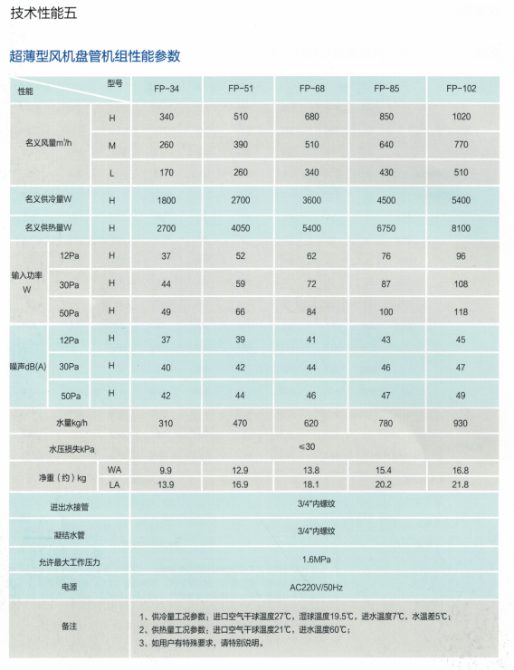 風機盤管機組主要由離心風機、盤管換熱器等構成,是中央空調系統的末端裝置,它廣泛應用于賓館、飯店、工廠、醫院、展覽館、商場以及辦公大樓等多房間或大空間工業和民用建筑的空調場合,以滿足降溫去濕、采暖等要求,為人們創造一個清新、寧靜、四季如春的工作和生活環境。 本公司風機盤管機組經過設計優化,盤管性能大幅提高,盤管機組分為高效型和標準型兩種;其中標準型風機盤管能滿足國標要求的各項參數,高效型風機盤管的性能參數優于國標要求20%以上。 FP-WA臥式暗裝風機盤管,此機組輪廓高度低,可理想的放入天花板內,結合室內裝修,配上出風口,是賓館、飯店、辦公室等理想的空調設備。 直流無刷風機盤管 使用直流無刷電機,實現高中低三檔調速以及無級調速的多樣化控制。 1、工作轉速范圍大,可滿足各種風量模式下的轉速要求。 2、隨著電機轉速降低,風量也隨之變化,這一變化降低了能耗,從而達到節能的效果。 水路控制系統 兩通或三通開/關型水路控制系統包括電動執行器,閥及其相關組件。該控制系統由工廠直接安裝在帶加長水盤的盤管機組上,通過控制冷水或熱水系統的開啟與關閉來實現室內溫度的自動調節。 1、安裝方便,現場只需連接水管及電源,即可投入使用。 2、設計緊湊,充分利用加長水盤空間,不需要改變機組尺寸。 FP-WA臥式暗裝風機盤管機組特點 1、安全可靠,壽命長 每臺盤管換熱器都經過壓力檢漏;進出水接管(集水頭采用鍛黃銅結構,可靠耐用);凝水盤噴塑處理,不生銹,全部材料系仿活型;電動機采用超低噪聲滾動軸承,無需用戶加油維修,使用壽命可達35000小時;電動機細長軸徑特殊處理無銹蝕。 2、效率高,能量組 風機盤管采用無縫紫銅管串套搞笑的雙翻邊鋁肋片并肋緊成一體,傳熱效率高,冷(熱)量富足,標準型盤管能滿足國標要求性能,高效型盤管性能達到了國際領先水平。 3、風量大,噪音低 風機盤管采用超廣角蝸殼,鋼板制多葉離心風輪,風輪與電動機可有多種優先匹配,以滿足風機盤管機組各個規格的需要。 4、選用靈活 考慮安裝工地各有其特殊性及場地限制等原因,本公司提供不同長度水盤供客戶選擇。 1、標準水盤——使所需安裝位置縮小,特別適用于安裝空間狹小的場所。 2、加長水盤——能更好的接住閥門漏水和凝結水。 風機盤管安裝、使用說明 1、風機盤管安裝在水平面上,保持垂直,不得傾斜;臥式機組,安裝時四個吊點一定要保持機組水平,防止凝結水管一端抬高造成凝結水外溢。 2、進出水管路應裝有閥門,以便于調節和檢修,并且必須注意進出水管的清潔和保溫工作,凝結水塑料管不得壓偏,不得有死彎,以保證使用時凝結水暢通。 3、機組三檔調速開關,開啟時應從高檔啟動,然后進行其他檔次的選擇,多機共用時,必須單機控制。 4、機組用電源:單相220v±10%,50Hz交流電機殼應安裝接地線,若機組啟動有困難,務必注意檢查電源是否正常,風輪與風機蝸殼是否接觸,機組安裝時必須注意外殼,換熱器肋片和風機等不要碰壞以免影響美觀和性能。 5、機組夏季供冷水溫度不得低于7℃,冬季供熱水溫度不得高于80℃,使用冷、熱水必須考慮個地方水質情況進行軟化處理。 6、機組允許使用壓力最大1.6MPa。 7、過濾器要進行定期清洗,保持清潔,確保傳熱良好。 8、接通電源后應先開動風機觀察其旋轉方向是否正確。 9、機組如果裝在暗處,要設有檢修門,便于常年維護。 10、機組在維修時應切斷電源。 11、卡式風機盤管安裝、使用詳見隨機說明書。 12、隨著我廠技術水平的不斷提高,對產品規格本廠有權更改,若機組的性能參數更改,以隨機的技術文件為準,不另行通知。 訂貨指南 1、選用風機盤管機組,請明確產品的規格型號及其進出水的左右式。 2、臥式暗裝風機盤管機組選配回風箱時,請注明回風方式是下回風還是后回風。 3、臥式暗裝風機盤管機組分低靜壓(12Pa)和高靜壓(30Pa、50Pa)三種,請在訂貨時注明。如無特殊要求,則按低靜壓型供貨。
