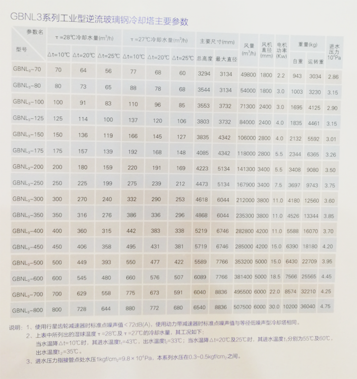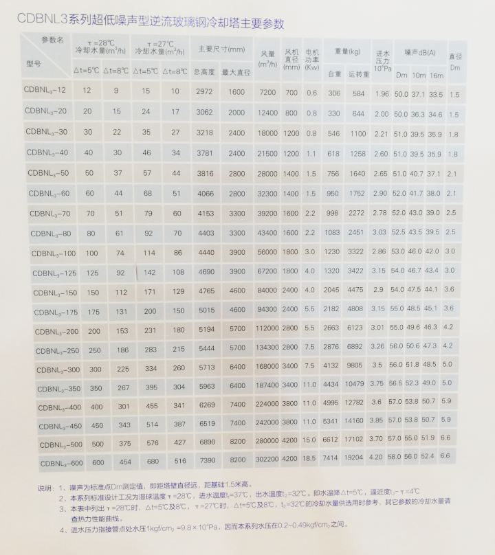 DBNL3100型; D-低噪聲; B-玻璃鋼; N-逆流式; L-冷卻塔;3-第三次改型設計;100-標準工況的名義流量度100m3/hGBNL3-100型;G-工業型中,高溫降; CDBNL3100型;CD-為超低噪聲型; 其它同上。